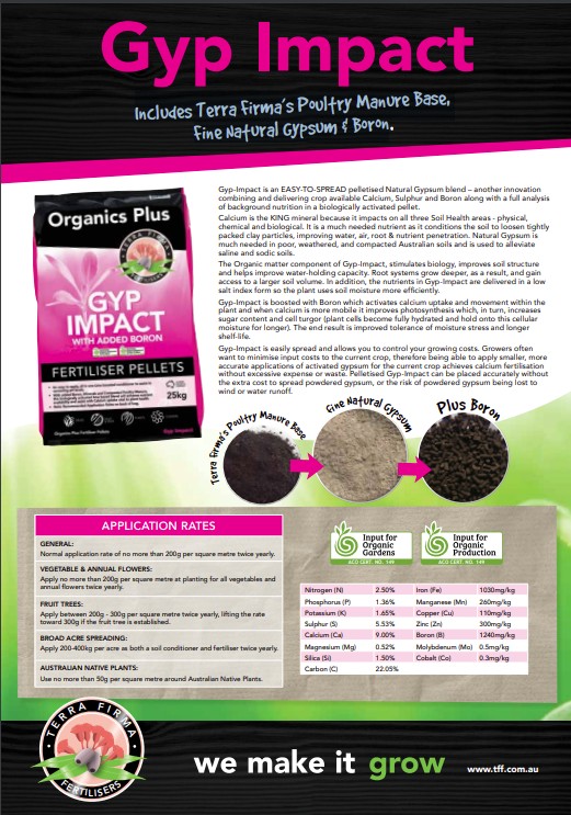 Gyp-Impact is an EASY-TO-SPREAD pelletised Natural Gypsum blend – another innovation combining and delivering crop available Calcium, Sulphur and Boron along with a full analysis of background nutrition in a biologically activated pellet. Calcium is the KING mineral because it impacts on all three Soil Health areas - physical, chemical and biological. It is a much needed nutrient as it conditions the soil to loosen tightly packed clay particles, improving water, air, root & nutrient penetration. Natural Gypsum is much needed in poor, weathered, and compacted Australian soils and is used to alleviate saline and sodic soils. The Organic matter component of Gyp-Impact, stimulates biology, improves soil structure and helps improve water-holding capacity. Root systems grow deeper, as a result, and gain access to a larger soil volume. In addition, the nutrients in Gyp-Impact are delivered in a low salt index form so the plant uses soil moisture more efficiently.